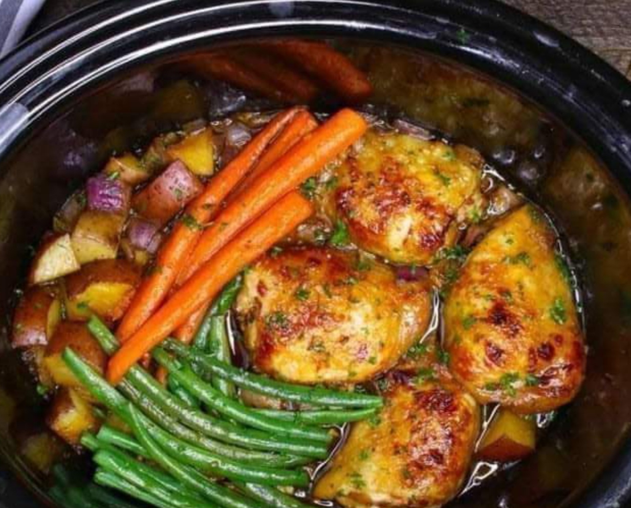 Add the chicken thighs, potatoes, carrots and onions to a 4-6 quart slow cooker.